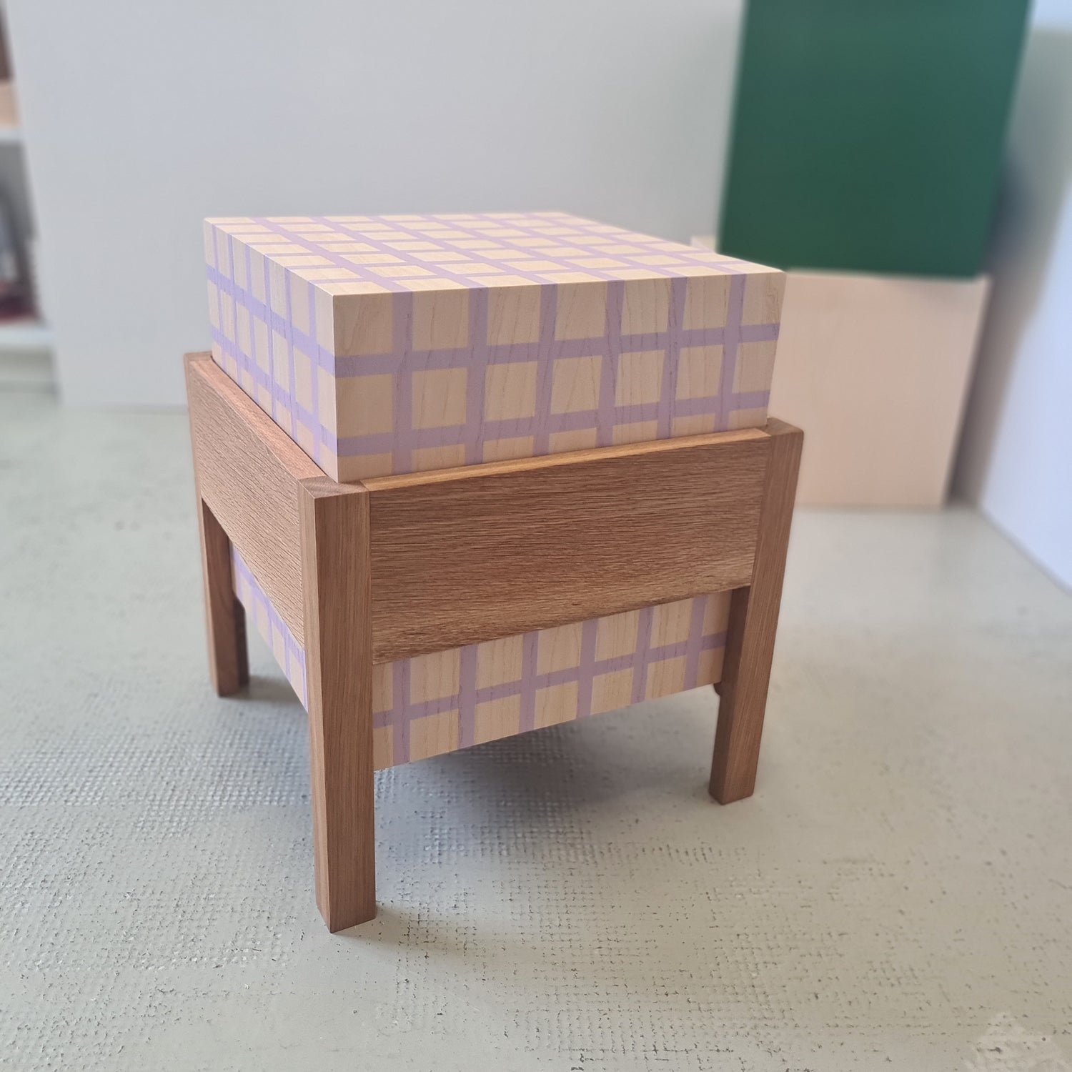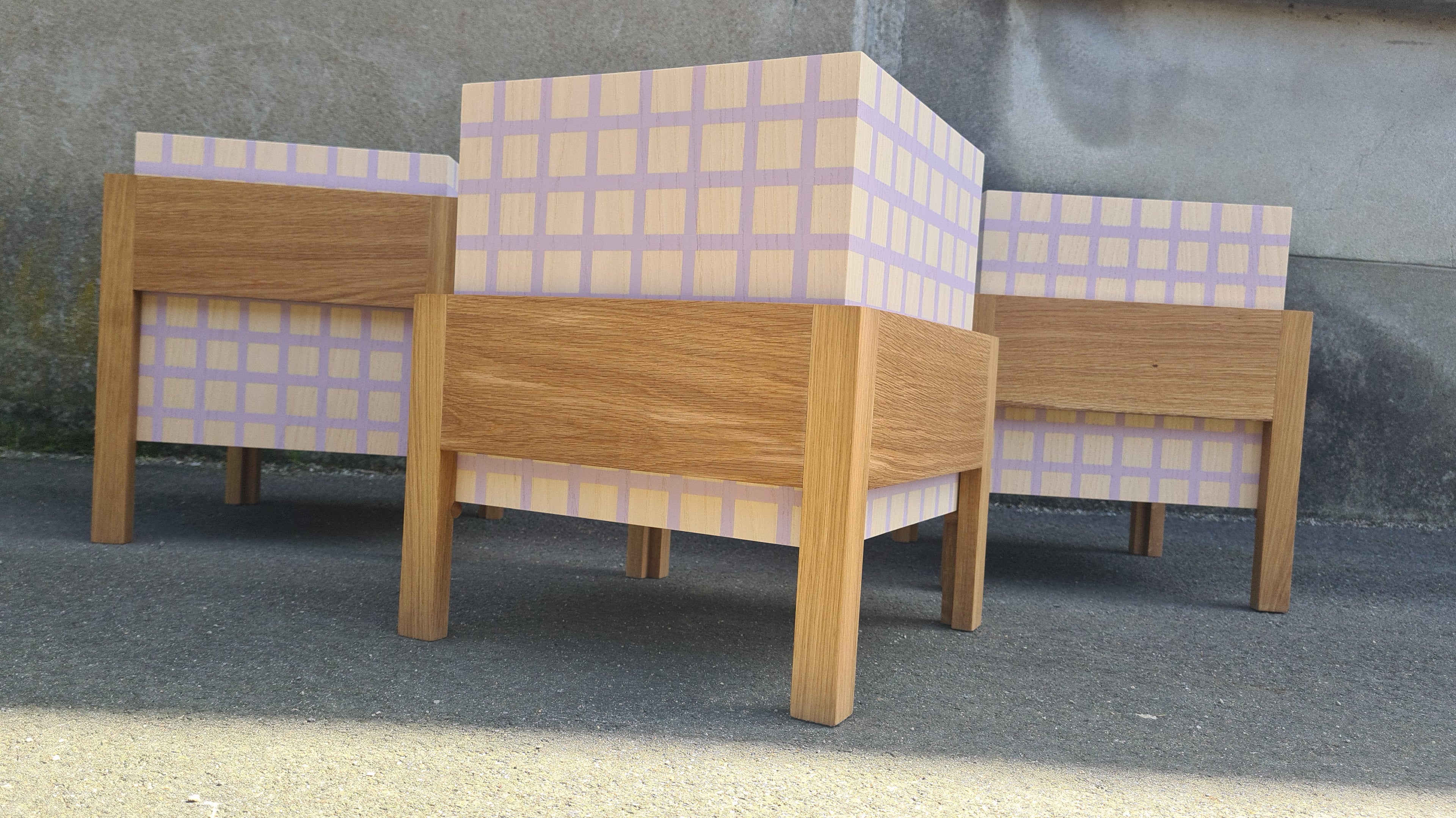 Ensemble de 3 tabourets dont le cube donne l’impression de monter et descendre dans son chassis, tout en restant à la même hauteur.